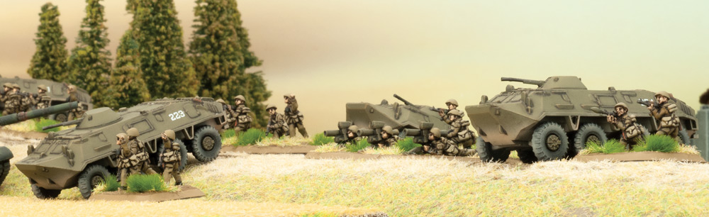 All three Motor Rifle battalions share a common combined-arms skeleton. Two or three companies ride into battle with organic tank, AA, recon, missiles, mortars, and Carnations. Moreover, line riflemen carry AKM (MPi-KM) rifles and RPG-7 launchers. Companies add PKM machine-gun platoons for sustained fire. Additionally, SA-7 Grails and AGS-17 launchers expand reach and suppression. The BMP-1 variant fights beside tanks with a 73 mm gun and Sagger missiles. It keeps squads protected and contributes meaningful fire support. The BTR-50 variant hauls up to twenty infantry on a tracked chassis. Moreover, these companies bring portable AT-3 Sagger launchers for long-range kills. The BTR-60 variant adds a turreted 14.5 mm gun and side doors. Additionally, its squads also tote ground-mount Sagger systems for reach. Battalion anti-tank platoons mount Saggers on BRDM-2 carriers. Each vehicle elevates six missiles under overhead cover with fourteen spares. Consequently, NATO armor risks angles others cannot easily punish. Mortar companies field quick-moving 120 mm tubes for smoke and HE. Therefore, infantry attacks do not stall against dug-in positions.
