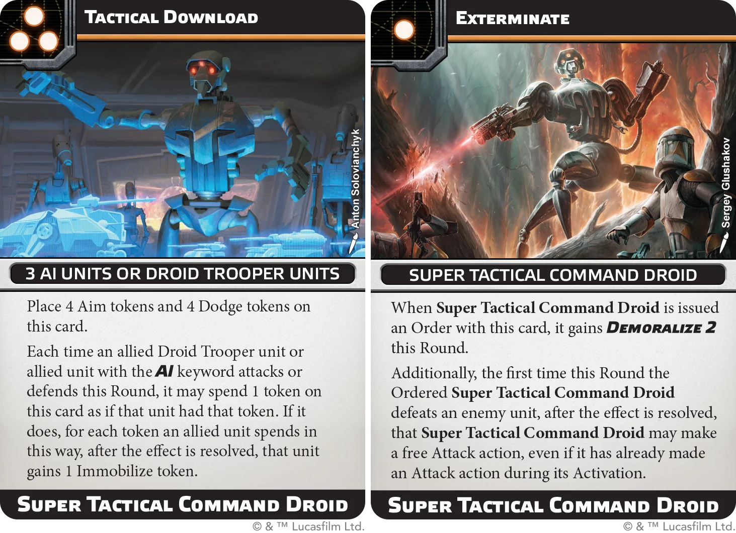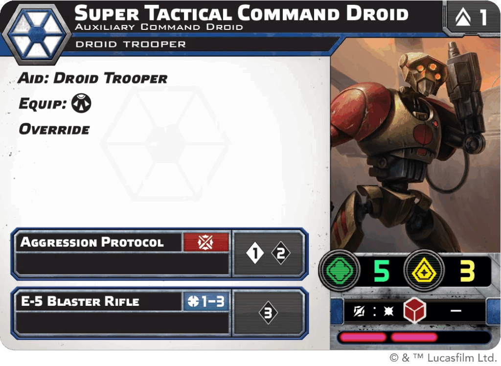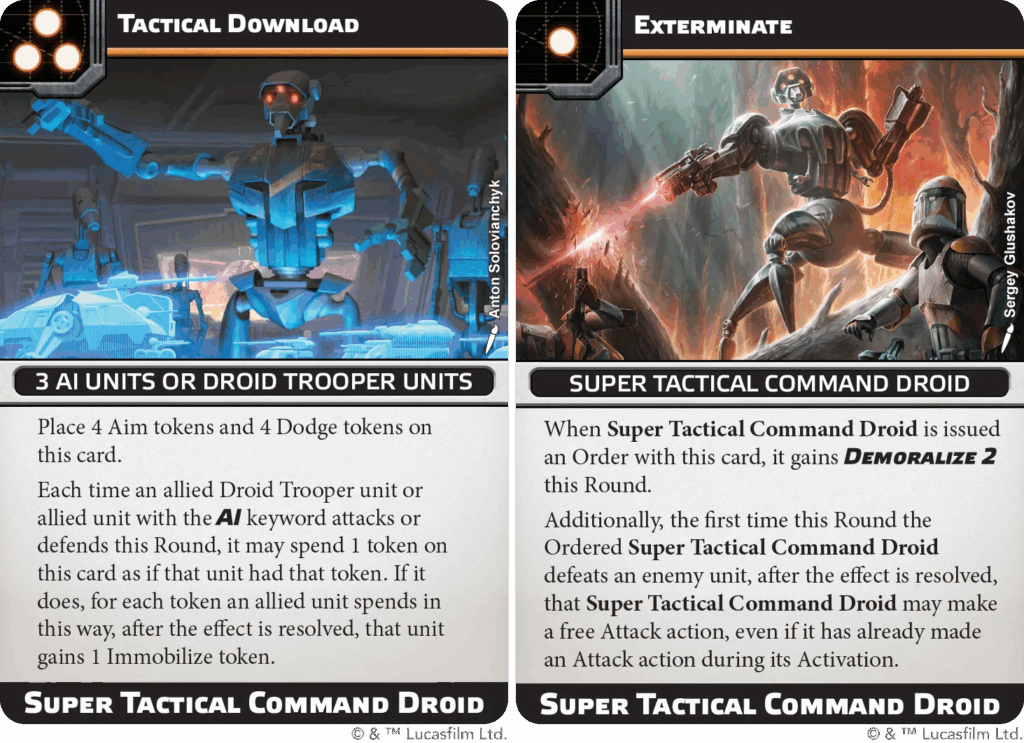 actical Download stocks a shared pile of four Aim and four Dodge for AI units to spend, at the cost of Immobilize when used. Exterminate gives the droid Demoralize 2 and a free extra attack whenever its ordered unit deletes a target.