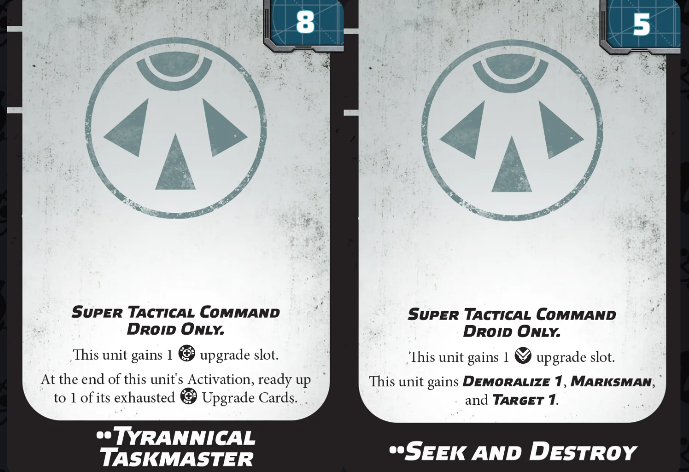 Super Tactical Command Droids come in two flavors. The Command and Control variant is a full Commander with a buffet of upgrade slots to supercharge your army.