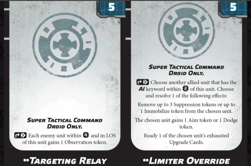 Super Tactical Droids can also mod themselves into elite problem solvers. Optimized Task Flow grants Direct to AI units for silky order control. Additionally, Enhanced Combat Subroutines add Sharpshooter 1 and Lethal 1 for meaner shots. Strategic Programming provides Strategize 1 to bank efficiency every round. For hardware, Heavy Arm Cannon throws 2 red and 3 white with Suppressive to crater lines. Moreover, Electrostaff grants Charge and immunity to Melee Pierce for dueling heroes. Mobility Upgrade adds Scale and Steady for ruthless positioning, while Expanded Databanks unlocks yet another Hardpoint slot. Finally, two new command cards cap it off. T