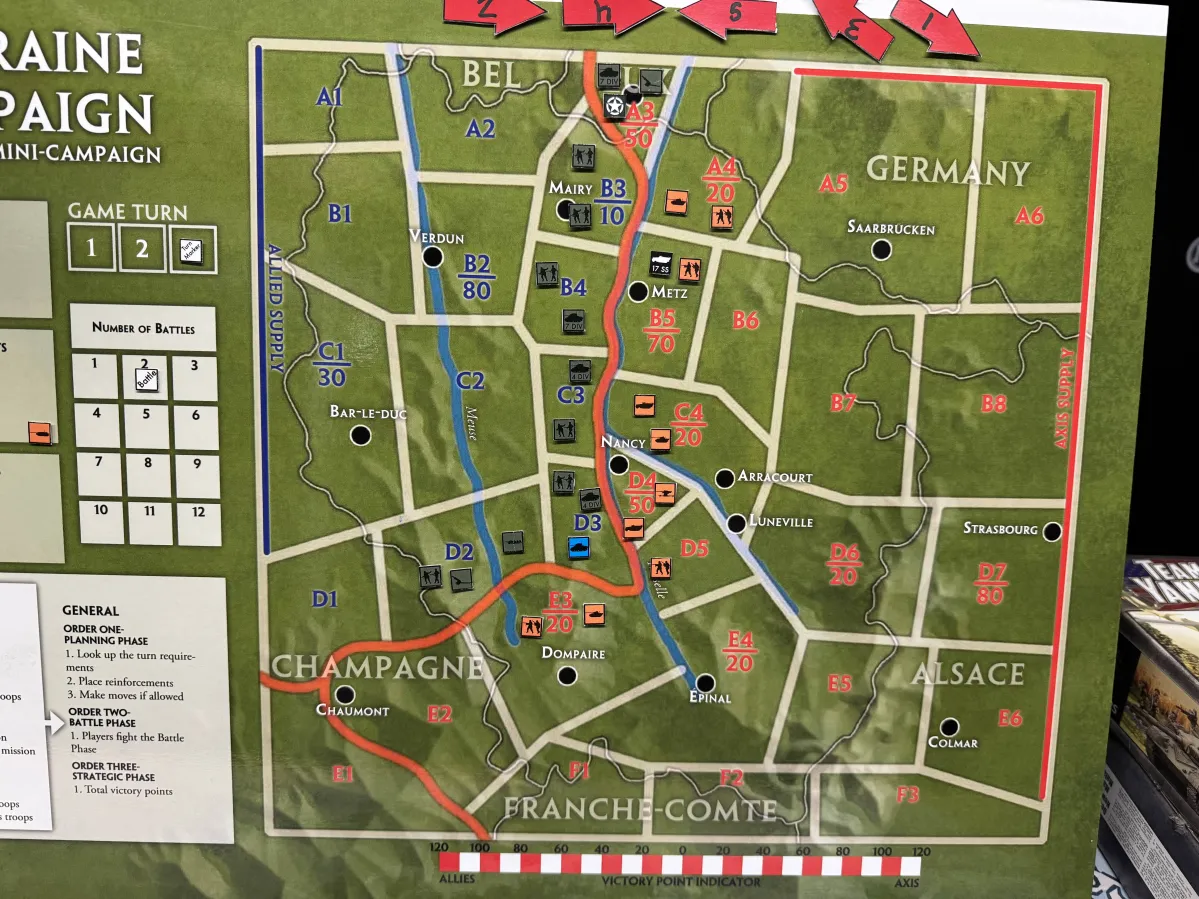 For the remainder of turn 2 the allies actually had some luck. The French tank and 155 artillery made three attacks into D2, failing the first two times but managing to get a solid victory in the final attempt.