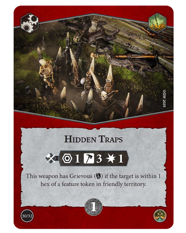Furthermore, it stretches reach and control. Keep Them at Bay adds Range against enemies on your side, while Mind Your Step pushes foes two hexes so long as they end in neutral or enemy territory. Hidden Traps gives a steady upgrade weapon that gains Grievous near a feature in your territory.