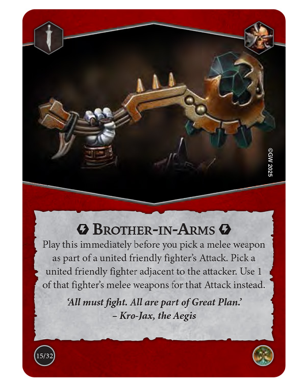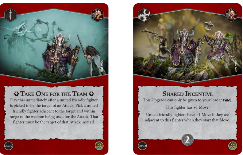Speed and weapon sharing amp it up. Shared Incentive gives your leader +1 Move and hands that bonus to united fighters that start adjacent. Additionally, Brother in Arms allows a united attacker to use an adjacent ally’s melee weapon. With upgrades like Entangling Strike gaining Cleave and Ensnare against Flanked or Surrounded targets, your pair plays become brutal. Therefore, objectives such as Aggressive Unity, Inevitable Outcome, Got Your Back!, and Outmuscle fall into place as you double team and drive back targets.