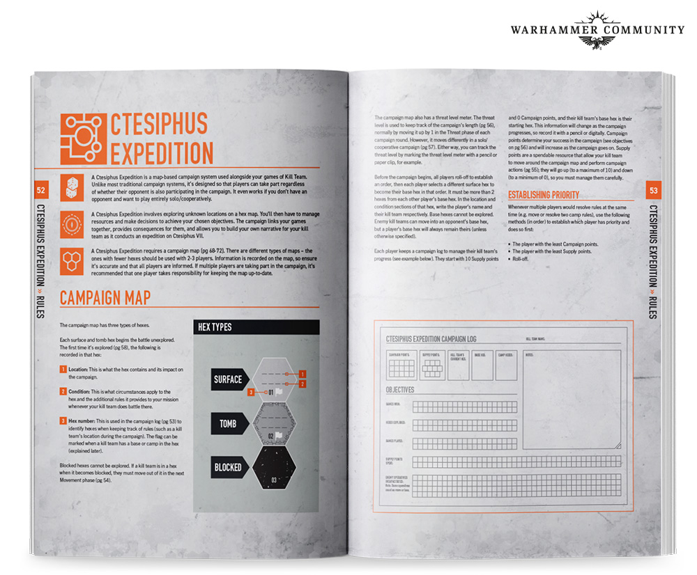 The Dead Silence Dossier book does more than stat blocks. It introduces Ctesiphus Expeditions, a hex-map campaign that progresses whether you have a partner or not. Initially you prowl surface sites, searching for clues and entrance points. Then you descend into the tomb to loot data and snatch translocation secrets before the sleepers rise.