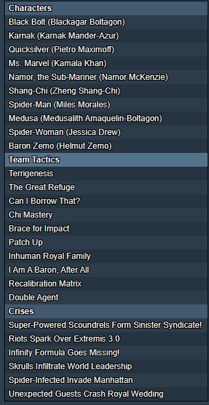 A Shadowlands Daredevil list won the tournament using Mephisto and Loki Prince of Lies as strong affiliated pieces. He accidently went unaffiliated in the last Round of the tournament but still won over another Inhumans list to win the tournament. It was a great tournament and I am still happy with Inhumans. I will be testing out Ultimate Spider-Man in many lists for the future, but don’t know if I want to splash him in Inhumans. Passing a power for him to Web Swing then a buffed attack that can Slow and pull an enemy off the point seems like a good effect in the first Round. However, 3 Threat Miles can do a similar effect and has an objective focused Spender. Gorgon is an Inhumans character that I might be interested in including in the future for his Charge superpower and ability to Spender with a Throw and Stagger.