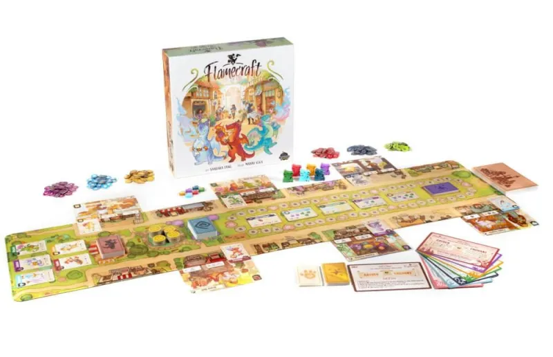 Compared to Wingspan, Flamecraft trades a bird tableau theme for dragon-themed shops, while boosting interactivity. Unlike Lords of Waterdeep, it emphasizes shared spaces over personal boards. It shares engine-building with Dune: Imperium or Terraforming Mars, but does so in a lighter, faster package. Where Raiders of the North Sea integrates worker placement and resource collection, Flamecraft adds modular shops and cascading abilities for more emergent combos. Although lighter than heavy euros, it balances strategy and accessibility better than many entry-level titles.