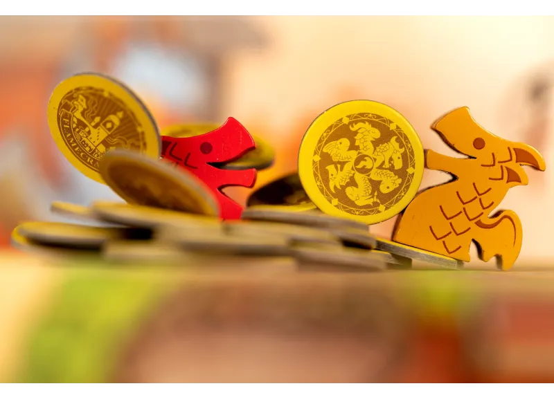 Each turn you travel to a shop and choose between gathering resources or enchanting it. Because shops gain bonuses when enchanted, timing your visit matters as the game progresses. Moreover, dragons placed at shops give extra effects when “fired up,” so positioning matters. The competition lies in getting good value before others alter the shops you plan to use. Although the artwork and dragon theme draw you in, the core is a strategic engine-building puzzle.
