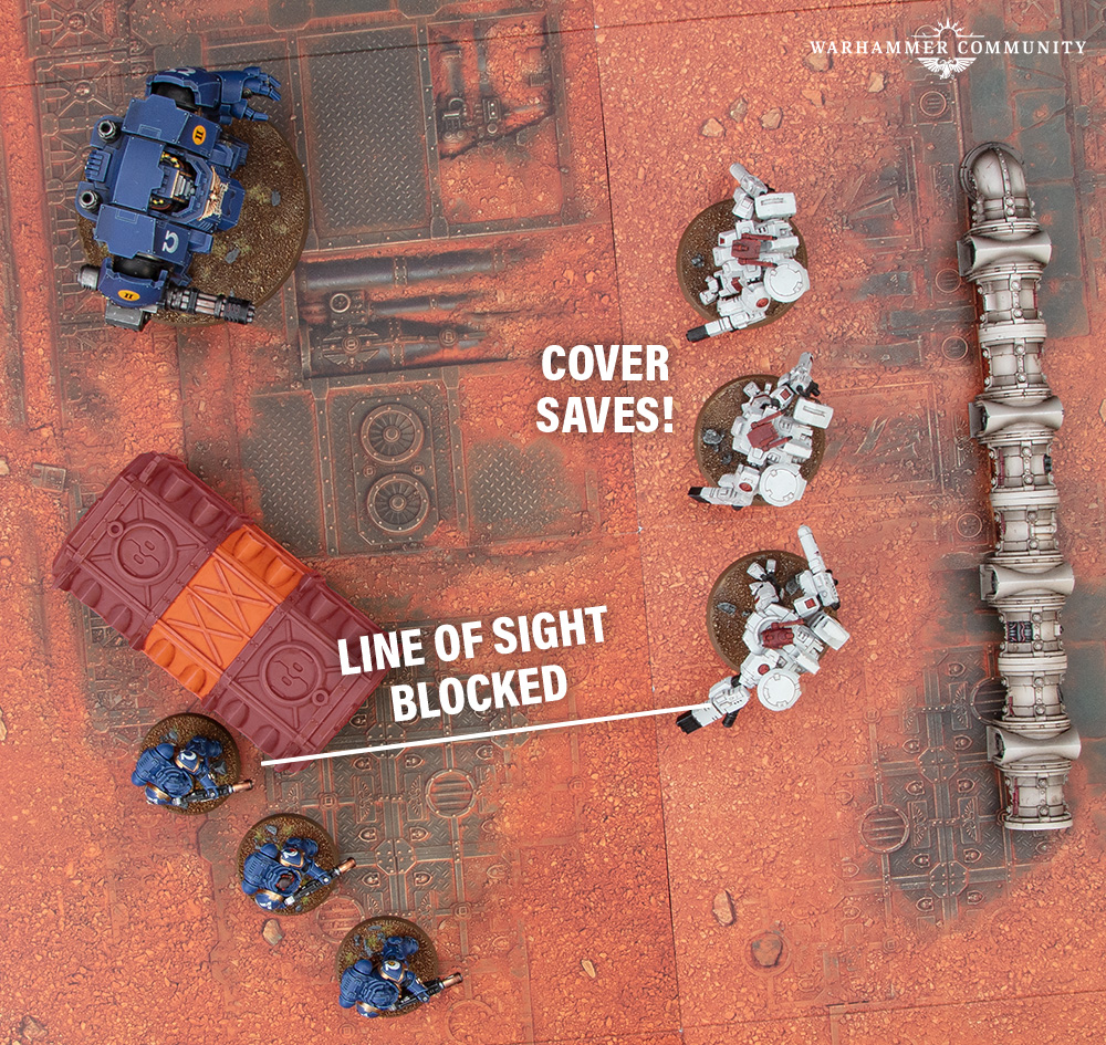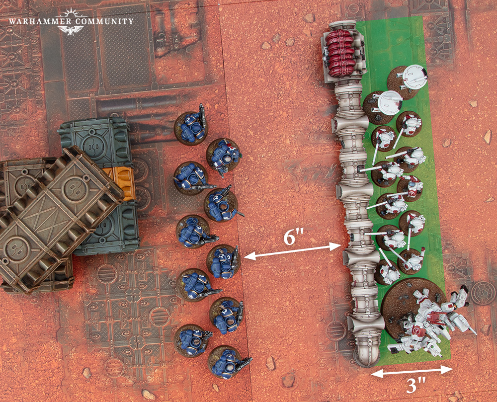 Fuel pipes and barricades reward clean placement. Fire Warriors wholly within 3 inches and only partially visible gain cover. The nearby Commander lacks the Infantry keyword and misses that benefit. Some players think close range removes cover if both sides touch the same pipe. However, partial visibility still grants the Benefit of Cover at that range. Also remember Engagement Range is 2 inches across pipes or barricades, which can bait awkward charges.