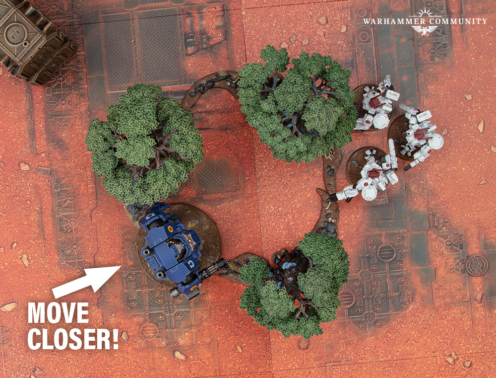 Woods flip depending on who is inside. Generally, shooting through woods grants the target cover unless they are Aircraft or Towering. However, a unit wholly within woods sees out normally. In Stephen’s example, a Dread not wholly inside gives T’au suits cover. If it nudges forward to be wholly inside, the suits become fully visible. Consequently, the T’au then shoot back through woods, which hands the Dread cover.