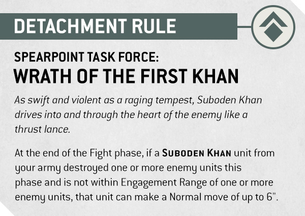 Suboden Khan leads the White Scars as a Spearpoint Task Force, and it screams tempo. Crucially, the detachment lets you Charge after Falling Back or Advancing, so you keep fighting on your terms.