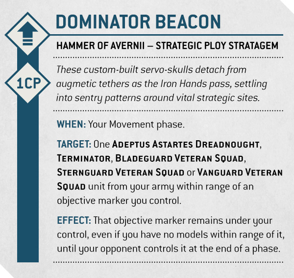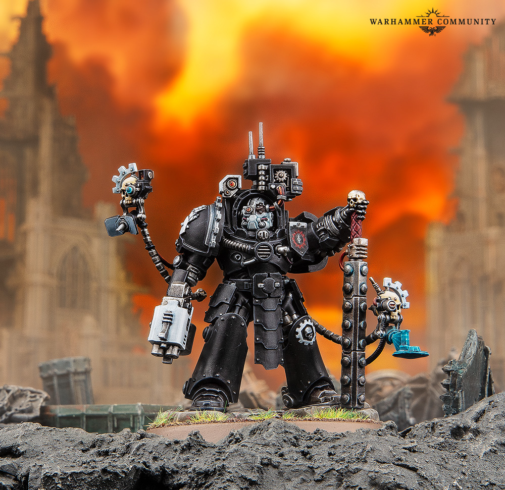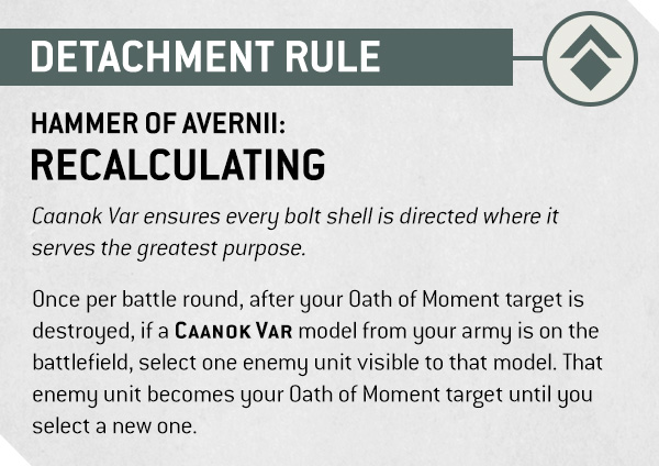 Caanok Var’s Iron Hands remix the 1st Company Task Force into the Hammer of Avernii. Critically, the detachment rule Recalculating lets you pick a new Oath of Moment target once per battle round after the current target dies, provided Caanok Var is on the field and can see the next victim.