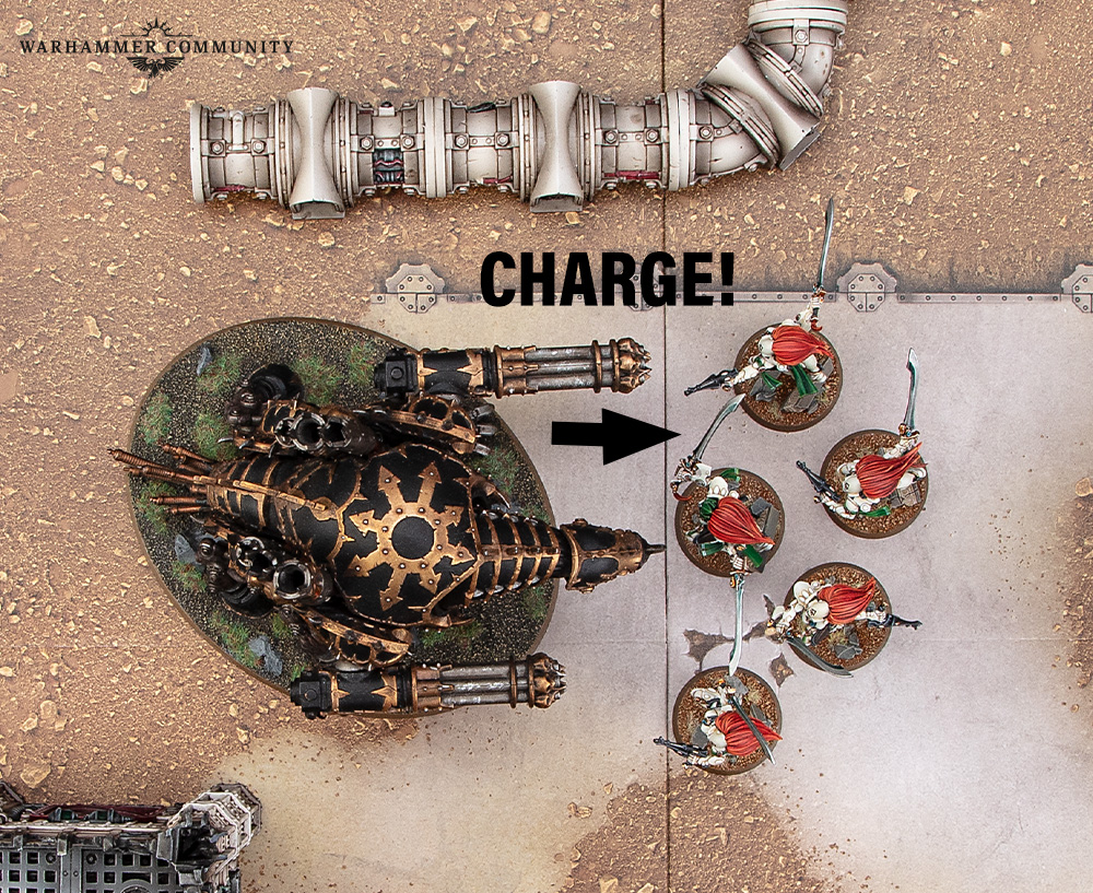Charging can deal damage before swings land. Skorpekh Lords, Einhyr Champions, and Megatrakk Scrapjets splash mortal wounds. Vehicles also Tank Shock for up to six mortals on the charge. Moreover, Brutalis Charge stacks more pain for the Brutalis Dreadnought. Therefore, you can delete one unit on impact, then Pile In 3 inches to fight another.