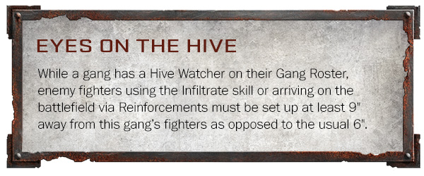 The Hive Watcher knows the hive like a rat knows vents. No tunnel, chamber, or lift slips their notice. With Eyes of the Hive, infiltrators and reinforcements must deploy 9 inches away from your crew.