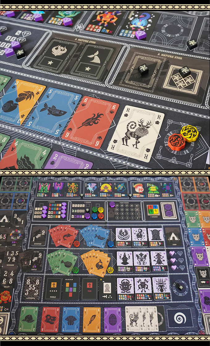 Since you begin with a small five‑card deck and acquire new cards throughout, the game emphasizes deck‑building and sequencing. Moreover, players must place cards into three rows under strict color and numbering constraints, which demands spatial logic and coordination. Because the game uses suit and number placement rather than direct confrontation, the focus lies more on puzzle systems than competition. Furthermore, the theme of “Eternals” and jewels adds atmosphere, although mechanically the game plays as a cooperative deck‑management puzzle.