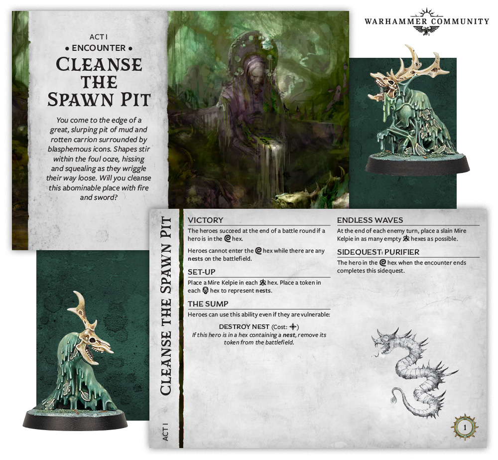 The article’s example is “Cleanse the Spawn Pit,” which uses map 1. Your heroes reach the lip of a disgusting pit full of rotten carrion and writhing Mire Kelpies, and the only way through is to burn out the nests. To win, a hero must reach a special spiral marked hex, but that hex is off limits while any nests remain. Meanwhile, Mire Kelpies keep spawning, so you are constantly juggling crowd control, survival, and the action cost of using Destroy Nest with your limited energy each turn.