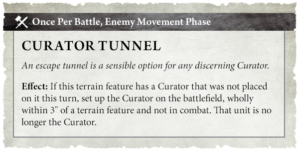 The Curator Tunnel rule lets you do exactly that. Once per battle, in the enemy movement phase, you can redeploy the Curator. If they started the turn elsewhere, you can pop them out within three inches of another terrain piece. They must not be in combat, and they stop being the Curator after the move. It reads like a secret back door carved through reality, which suits many factions.