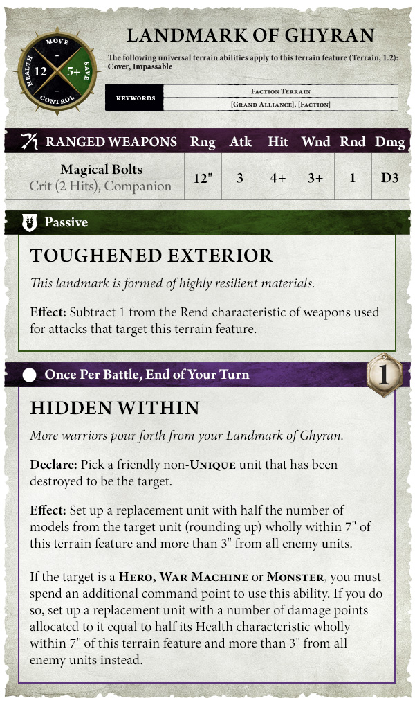 The remaining destiny points purchase Hidden Within, a once per battle reinforcement trick. At the end of your turn, you pick a friendly destroyed unit as the target. You then set up a replacement unit with half the models within seven inches of the Landmark, outside three of enemies. If the destroyed unit was a Hero, War Machine, or Monster, you spend a command point and bring it back half damaged instead. It feels like warriors crawling from a portal or clawing out of the roots of Ghyran itself.