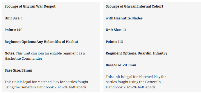 Two fresh Scourge of Ghyran warscrolls round things out. The War Despot version turns his usually decorative Daemonfire Pistol into a practical tool, letting him shoot into combats where foes have proved unworthy of his axe work. Additionally, his command abilities help nearby units reposition quickly and efficiently, making him a proper battlefield coordinator. He also becomes a focus for daemonic power, terrifying his underlings into fighting as though they too were empowered by Hashut. On the table he clocks in at 140 points, is a single model on a 32mm base, and can join eligible Helsmiths regiments as a Hashutite Commander. He is fully legal for matched play in the General’s Handbook 2025–26 battlepack.