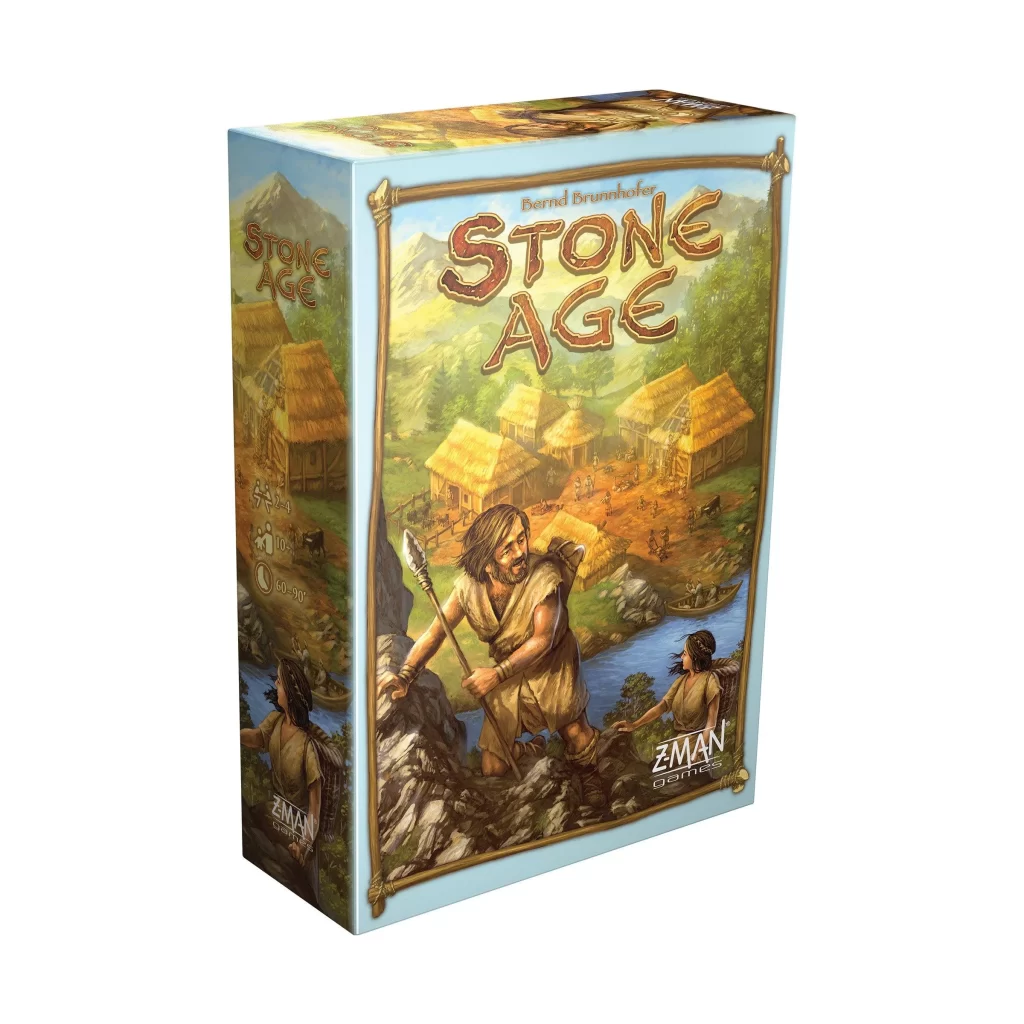 You send your tribe members to gather resources like wood, clay, stone, gold, or food. Then you use those resources to build huts, develop agriculture, craft tools, and acquire civilization cards. Because workers consume food every round, you must balance expansion with sustenance. As a result, Stone Age blends worker placement, resource management, and a bit of luck via dice rolls — creating a light-to-midweight Eurogame about building a thriving tribe under pressure.