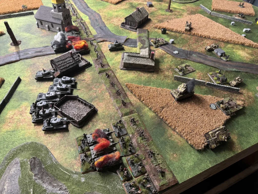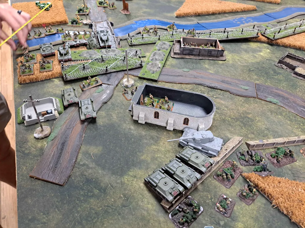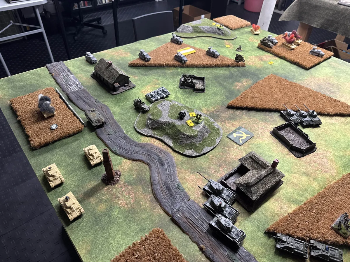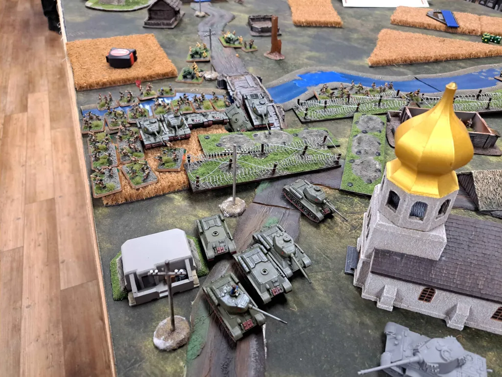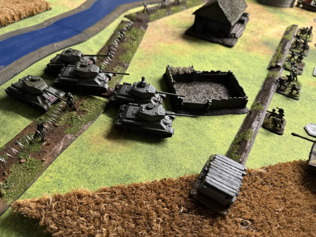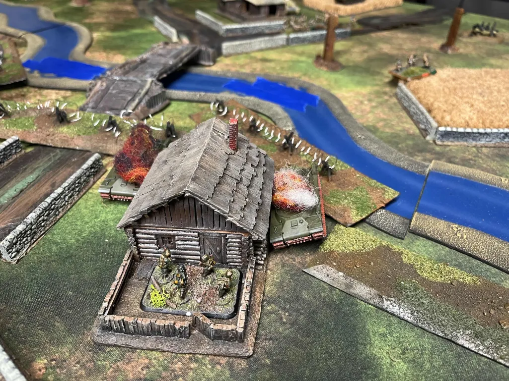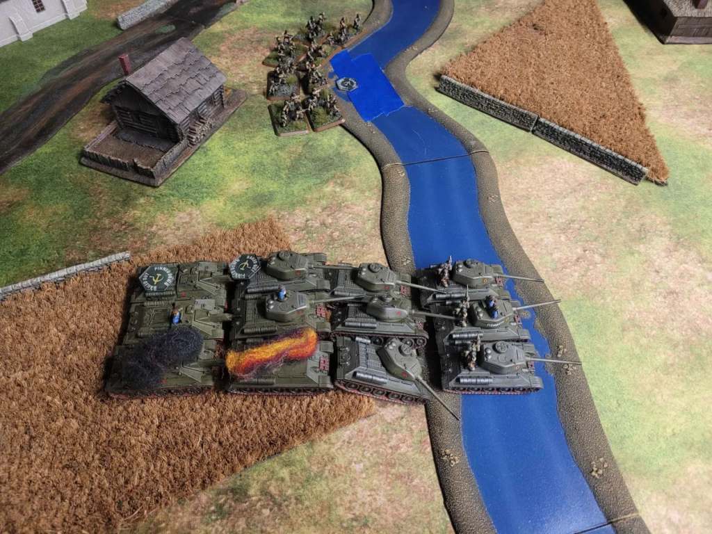 The germans buy themselves some time by stopping the soviet assault on the banks of the Berezina river. A single King Tiger tank takes out 6 enemy tanks including 3 on overwatch to hold the crossing….for now