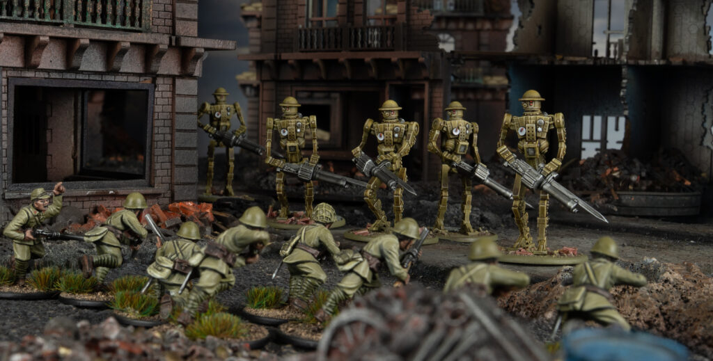 Mk I Automated Infantry are the prototype foundation, not the polished instrument. They share Lumbering, Augmented, Large, Fearless, Computational Systems, but they also have First Off the Line. That rule gives a flat minus one to hit when shooting. Combined with Computational Systems, they reliably hit on 5+ whether Advancing or Firing. Because they are Fearless, they never carry Pins, so they do not degrade under pressure. For a slow unit that must Advance constantly, that consistency is a big deal.