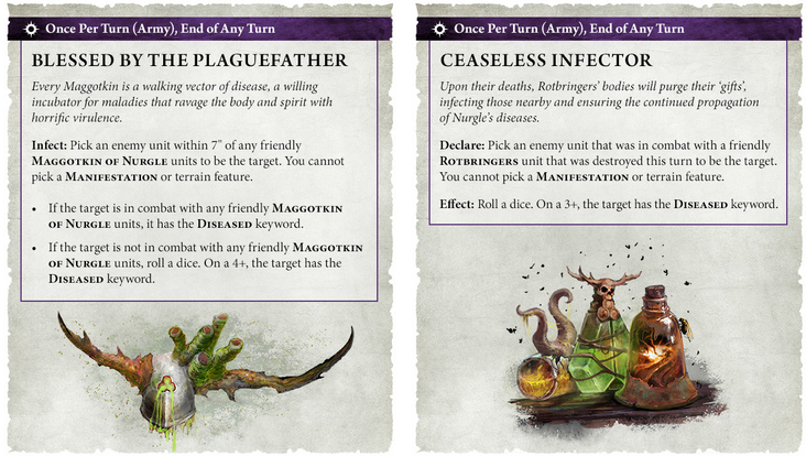 The article even spells out the ability timing and steps. It is once per turn for the whole army at the end of any turn. You pick an enemy unit within 7 inches of any friendly Maggotkin unit. You cannot pick manifestations or terrain features. If the target is in combat with any friendly Maggotkin, it is automatically Diseased. However, if it is not in combat, you roll a die. On a 4+, it becomes Diseased. So, you can now start outbreaks at range, which is nasty against careful deployment.