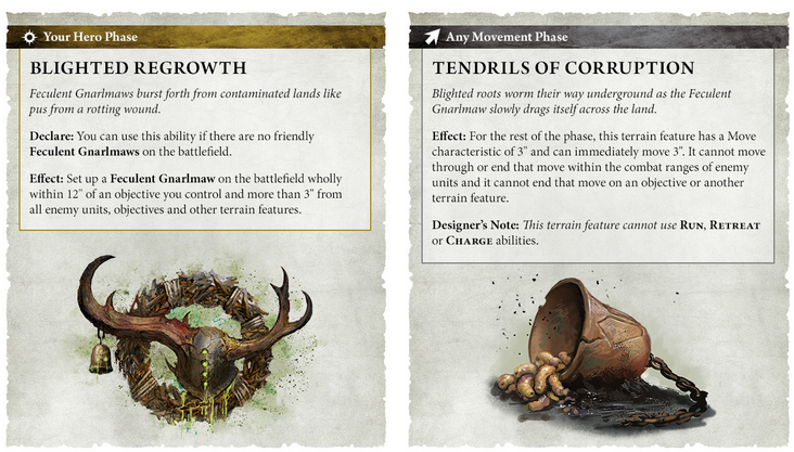 The last new battle trait pushes the Maggotkin table identity even harder. Blighted Regrowth lets you resprout a Feculent Gnarlmaw, as long as you are holding an objective. Additionally, it only works if you currently have no friendly Gnarlmaws on the battlefield. In your hero phase, you set up a Gnarlmaw wholly within 12 inches of an objective you control. It must also be more than 3 inches from enemy units, objectives, and other terrain features. So, it is a controlled spawn, but it rewards playing the mission.