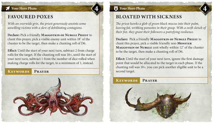 Then it spotlights two specific prayers in detail. Favoured Poxes targets a visible enemy within 18 inches. You roll a D6 chanting roll, and on a 4+ it works. Until the start of your next turn, the target suffers minus 2 to charge rolls. However, if you roll 10+, it changes to subtracting 1 die from charge rolls, to a minimum of 1. So, it goes from slowing the charge to making charges far less reliable.