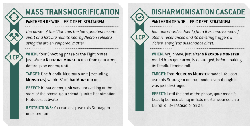 Disharmonisation Cascade is the other highlight, and it is wonderfully petty. When a NECRONS MONSTER model dies, you can pop this before the Deadly Demise roll. Then, for the rest of the phase, its Deadly Demise mortal wounds trigger on a 3+ instead of only on a 6. Therefore, if your shard gets punched out, it can still explode like a grudge.