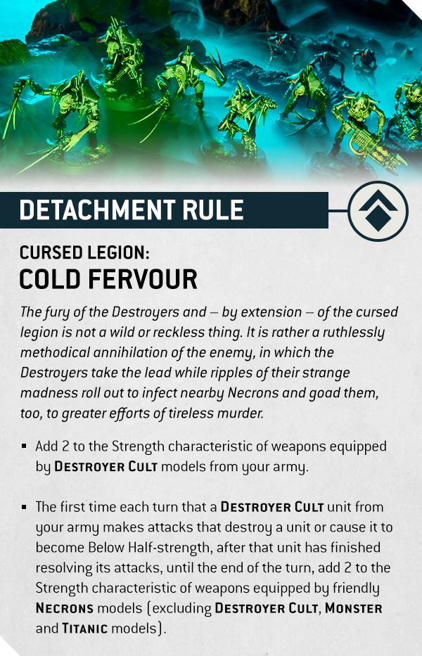 The Detachment rule, Cold Fervour, starts by giving all DESTROYER CULT models +2 Strength on their weapons. Therefore, your melee and shooting from Destroyers hit a whole new breakpoint tier. Then it adds a ripple effect. The first time each turn a Destroyer Cult unit destroys an enemy unit or knocks it below half strength, the rest of your Necrons get infected by the madness. So, until end of turn, friendly NECRONS models gain +2 Strength too, except for Destroyers, Monsters, and Titanic models. That means your “normal” units suddenly swing way above their weight for a turn.