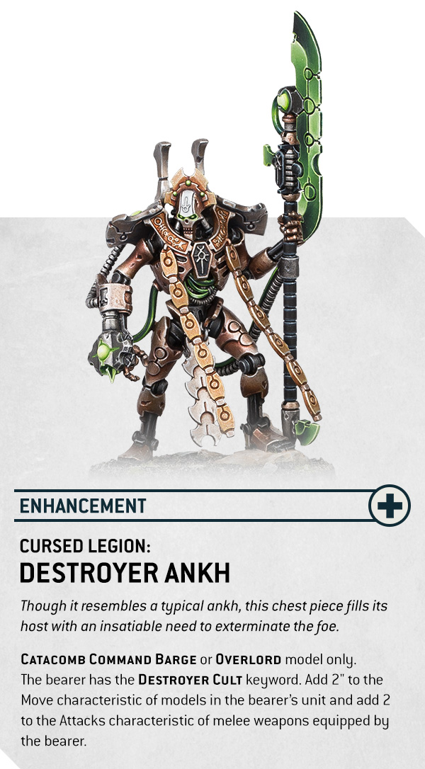 There is also an Enhancement called the Destroyer Ankh, and it is basically “convert this Overlord into a problem.” It can go on an Overlord or a Catacomb Command Barge. Then it gives the bearer the DESTROYER CULT keyword. Additionally, it adds 2 inches of Move to the bearer’s unit, and it adds 2 attacks to the bearer’s melee weapons. With the Detachment strength bonus stacked on top, that is a brutal upgrade.