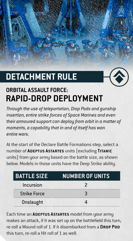 The Detachment rule, Rapid Drop Deployment, starts during battle formation. So, you pick a number of ADEPTUS ASTARTES units based on game size. You get two in Incursion, three in Strike Force, and four in Onslaught. Those units gain Deep Strike, and that is already scary.