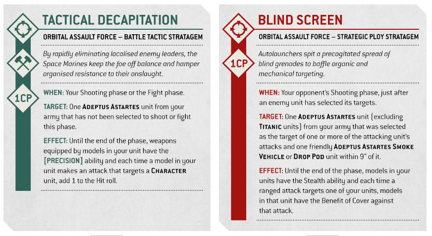 The Stratagems scream “hit the head, then vanish.” Tactical Decapitation gives your unit Precision for a phase, and it also adds +1 to hit versus Character units. So, it is a leadership sniping button, which fits the drop assault fantasy. Meanwhile, Blind Screen is your survival tech for the clapback turn. It triggers in your opponent’s Shooting phase, after targets are declared. Then it keys off a nearby SMOKE Vehicle or a Drop Pod within 9 inches. Your units gain Stealth, and they also get Benefit of Cover. So, your fresh arrivals are not just standing there naked.