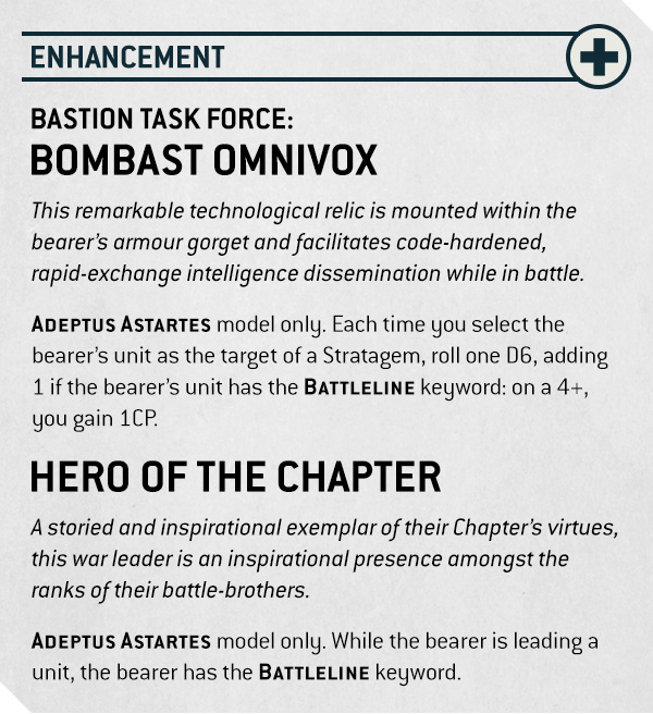The Enhancements push command and mission play. Bombast Omnivox is a CP engine. So, when the bearer’s unit is targeted by a Stratagem, you roll a D6. On a 4+, you gain 1CP, and you add 1 if the unit is Battleline. Additionally, putting this on a Captain gets extra cheeky. Rites of Battle discounts a Stratagem, and you might still refund CP anyway.