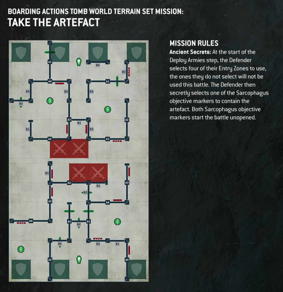 Take the Artefact plays like a grimdark shell game. The Defender chooses which four entry zones are in play, and then secretly hides the objective in one of two sarcophagi. Both start unopened, so the Attacker has to read the board, call the bluff, and fight for the right coffin.
