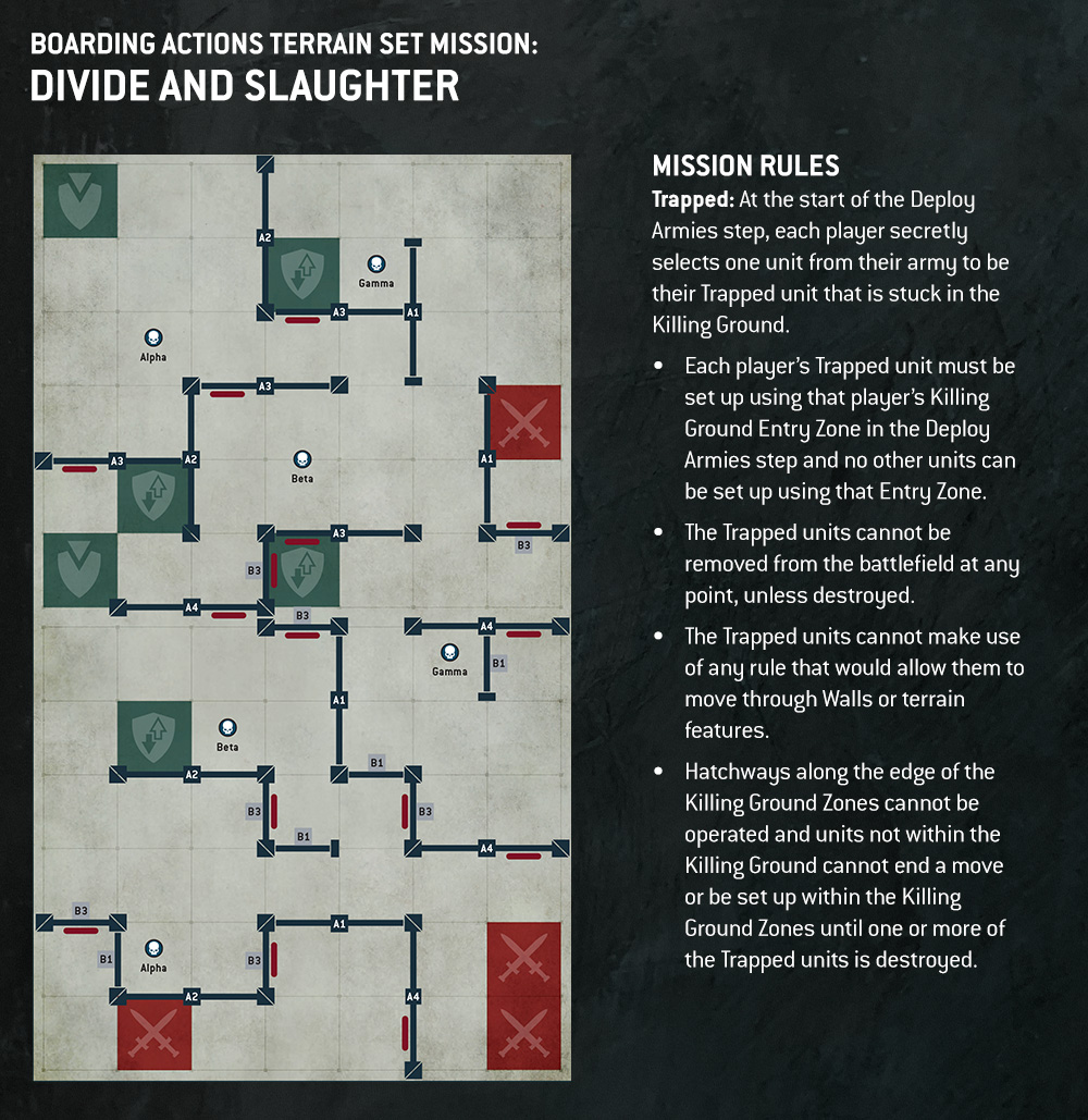 Divide and Slaughter is peak drama. At the start of deployment, each player secretly picks one Trapped unit. Then, those Trapped units deploy into the Killing Ground, and nobody else can use that entry zone. Also, the Trapped units cannot leave unless destroyed, and they cannot phase through walls. Finally, hatchways around the Killing Ground cannot be operated, and no outside unit can enter until one Trapped unit dies. So, you get a brutal mini duel inside a broom closet while the wider battle rages.