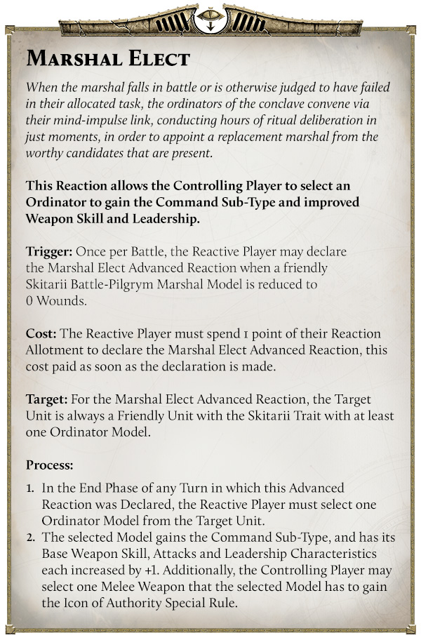 The coolest tech priest nonsense here is the Marshal Elect Reaction. Once per battle, when your Battle Pilgrym Marshal drops to 0 Wounds, you can spend 1 point of your Reaction allotment and promote an Ordinator in a friendly Skitarii unit. Then in the End Phase, that chosen model gains the Command subtype, plus +1 Weapon Skill, +1 Attacks, and +1 Leadership. Additionally, you can upgrade one of their melee weapons with Icon of Authority, which helps keep the chain of command functional.
