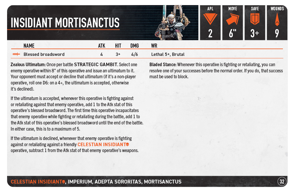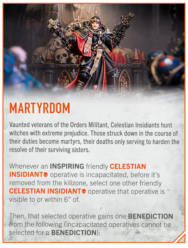 They get three team abilities, which is a flex, even if one mostly matters into Psychic foes. First is Inspiration, which triggers when an Insidiant Charges or incapacitates a tougher enemy with 6+ Wounds. While Inspiring, all their weapons gain Severe, meaning you can flip a normal success to a crit if you kept no crits. Then comes Martyrdom, because of course it does, and it triggers when an Inspiring operative is incapacitated. Before removal, you pick a visible ally or one within 6 inches, and that ally takes one Benediction: +1 APL, Ceaseless, heal D3+2 wounds, or a free Charge or Dash with tight movement limits.