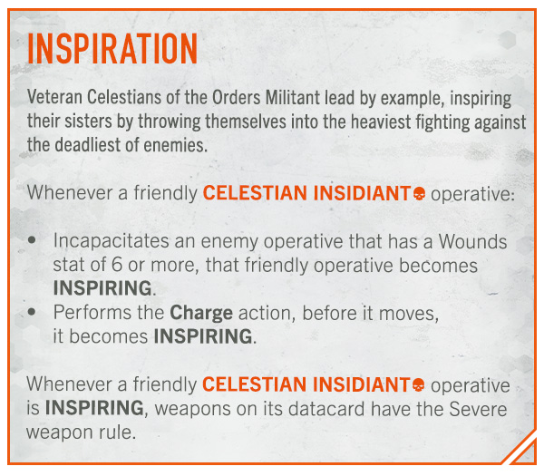 First is Inspiration, and it rewards aggressive, meaningful plays. An operative becomes Inspiring if it Charges before it moves, or if it incapacitates an enemy with a Wounds stat of 6 or more. While Inspiring, weapons on its datacard gain the Severe rule. And if you forgot, Severe lets you turn one normal success into a crit, as long as you retained no crits. So the rule is a real spike button, especially when you are trading in melee.