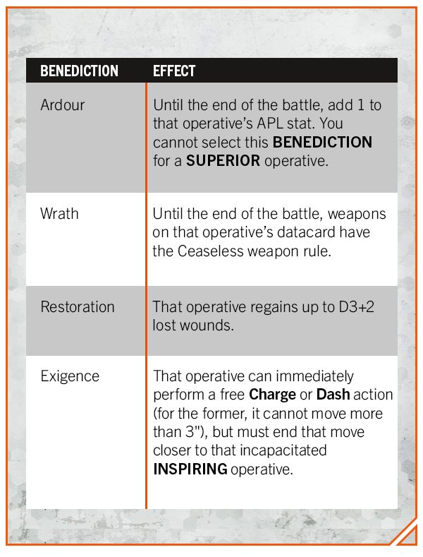 Then, once Inspiration is rolling, Martyrdom turns losses into momentum. When an Inspiring operative gets incapacitated, you select another friendly Insidiant that is visible to it or within 6 inches. That chosen operative immediately gains a Benediction, and you pick one of four. Ardour gives +1 APL until battle end, but not on the Superior. Wrath grants Ceaseless until battle end, which means more reliable hits. Restoration heals up to D3+2 lost wounds, which is huge mid-brawl. Exigence gives a free Charge or Dash, although the Charge is capped at 3 inches, and you must end closer to the fallen martyr. So it is literally “get in there,” but with guardrails.