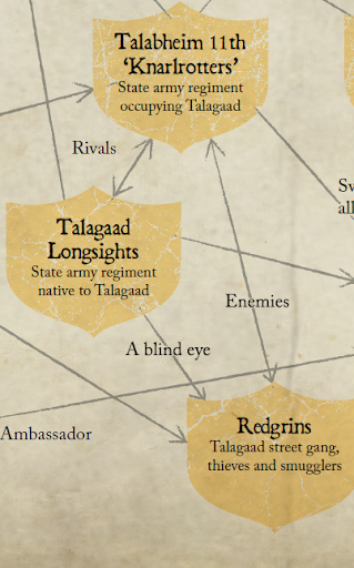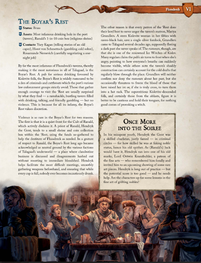 The article spotlights the Boyar’s Rest, a landmark in Flussdreck. It is infamous, and it is also useful. Because it is where you meet Contacts who hook you into the setting. Everyone shares an ally, Jaime de Sabatin, a drifter dealing in looted artefacts. So the first adventure, The Hand That Feeds, naturally points you there.