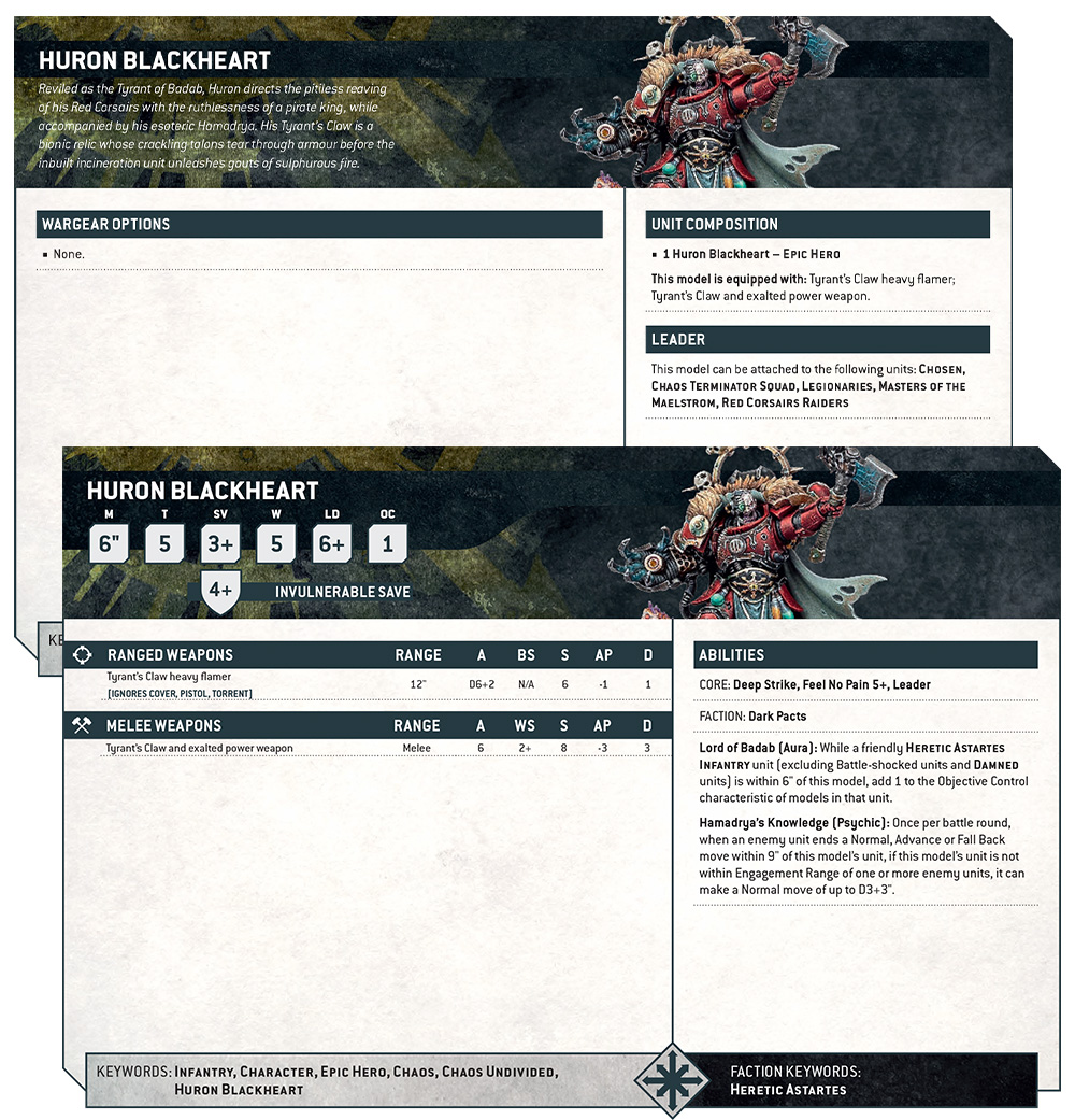 Huron is built to scrap, and his melee profile is pitched as Terminator splitting scary. Also, his Tyrant’s Claw packs a compact heavy flamer with the Pistol ability. So he can roast someone up close, and then punch straight through the survivors.