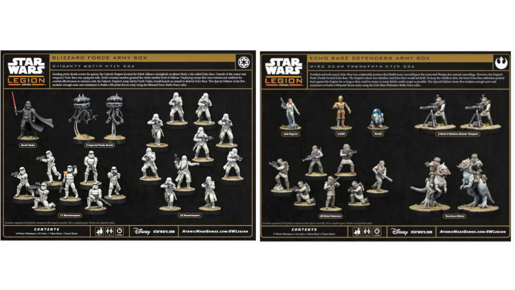 Unlike earlier army boxes, these do not sound like true starters. However, while the listing hints at dice and tools, the text says that might not be accurate, and Atomic Mass Games was contacted to confirm. Also, it is worth a chuckle that the promo paint job is not on snowy bases, because The Empire Strikes Back did not exactly hide the weather.