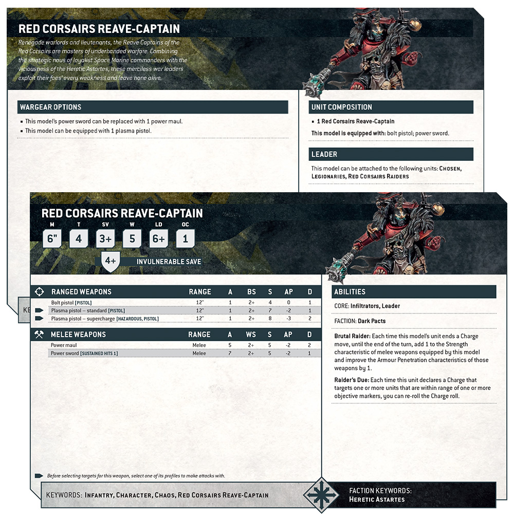 Bigger raiding parties usually roll with a Reave-Captain. Unfortunately, his job is herding maniacs, or Huron hears about it. That pressure cooker builds a Brutal Raider mindset, which means chaining charges from one melee to the next. Meanwhile, the Captain still has that Astartes tactical brain under the spite.
