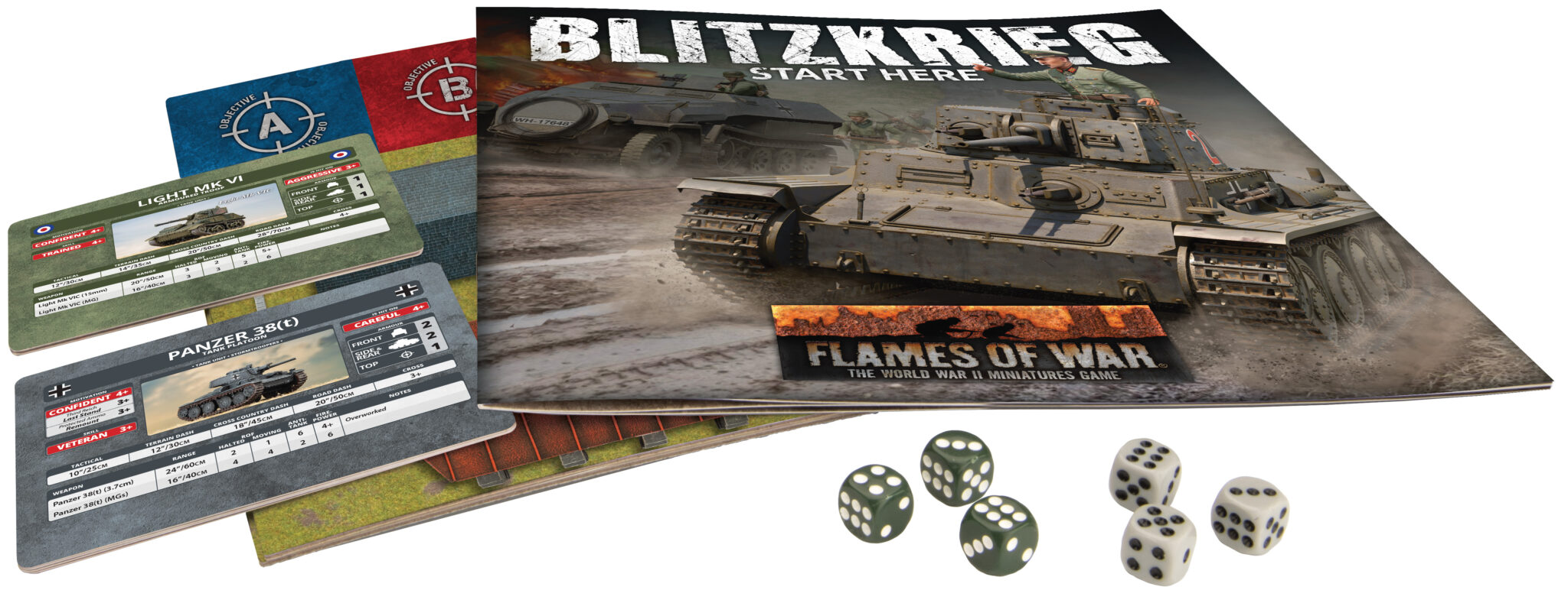 You get five plastic tanks that need assembly. Specifically, it includes three British Light Mk VI tanks and two German Panzer 38(t) tanks. You also get two unit cards and six dice, split into three British and three German. Additionally, there is a thick cardboard tokens and terrain sheet. Finally, you get a “Start Here” rulebook plus a downloadable full rulebook.