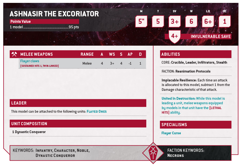 He also trimmed tassels, added a severed arm, and slapped on flayed skin. Therefore, Ashnasir the Excoriator got a creepy demi-cloak. On the rules side, he went Dynastic Conqueror with Flayer Curse. He packed flayer claws and United In Destruction for tasty Lethal Hits. However, he has not fielded Ashnasir yet, because he needs painted Flayed Ones.