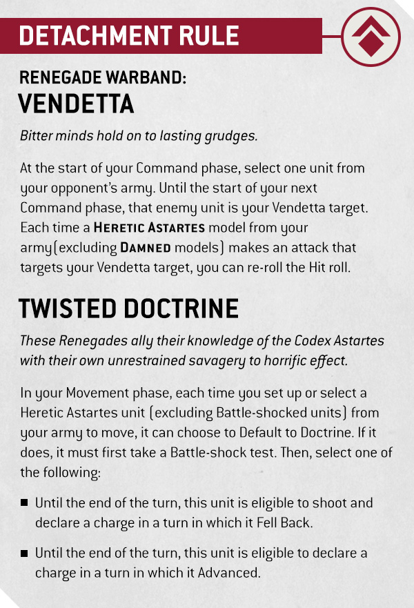 Compared to most Traitor Legion slackers, the Red Corsairs feel weirdly focused. Therefore, the Renegade Warband Detachment straight up drops Dark Pacts. Instead, you get Vendetta, which tags one enemy unit each Command phase. Then, your Heretic Astartes get hit rerolls into that target.