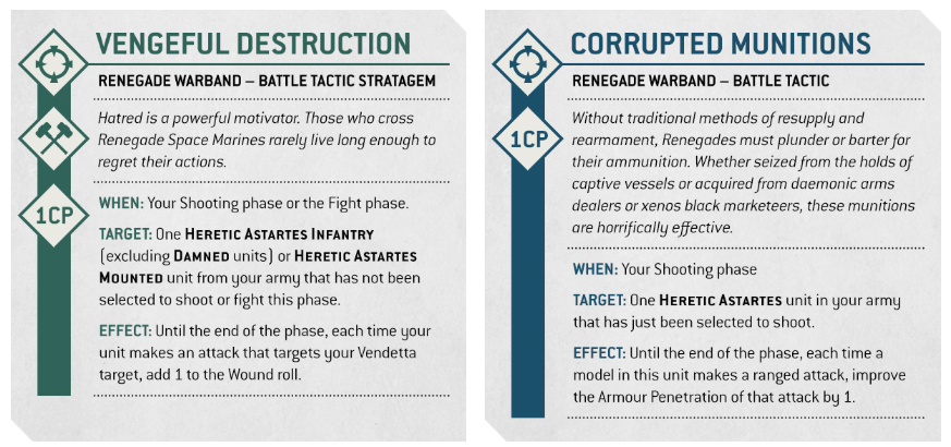 The Stratagems push the theme hard too. For example, Vengeful Destruction adds +1 to wound into your Vendetta target. Then, Corrupted Munitions improves AP by 1 for ranged attacks. So, you can point at a problem unit and delete it with prejudice.