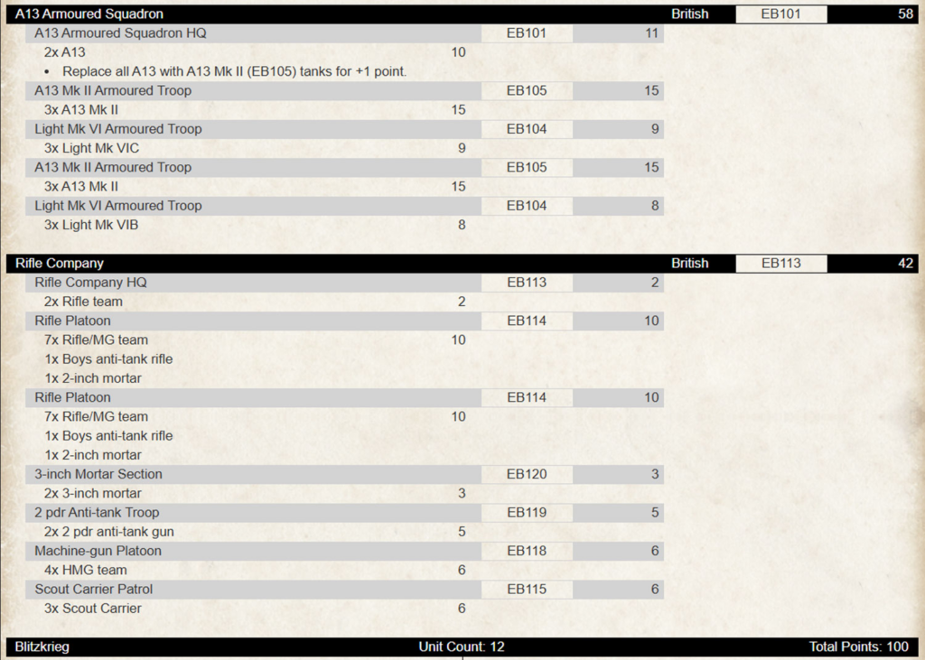 If you want a second tank formation, you can drop the Matildas and reorganize your existing tank troops into an A13 Armoured Squadron. Then you add the extra tank HQ and troop boxes to make a proper hammer and anvil setup, with infantry holding and tanks swinging. That path costs $246, adding a Mk VI troop, an A13 troop, and scout carriers.