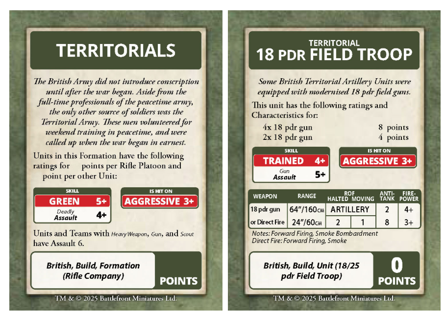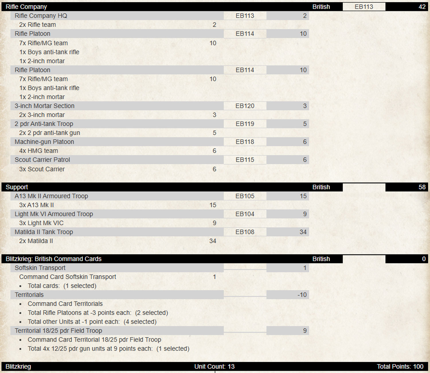 Next, the Territorial Rifle Company uses the same structure, but it gets themed by Territorial command cards. However, the trade is worse ratings. Skill drops from Trained 4+ to Green 5+, assault gets worse, artillery shifts from Veteran 3+ to Trained 4+, and they become easier to hit at Aggressive 3+ instead of Careful 4+. Therefore, the list leans more defensive, adding an 18 or 25pdr troop plus a transport card to reposition it. That version costs $227 with artillery, scout carriers, and Matildas.